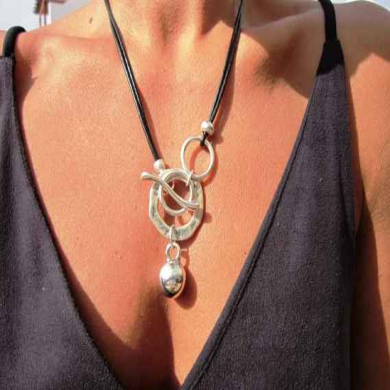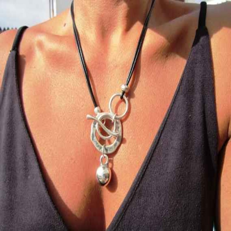 Bu kolye hakiki deri ve gümüş kaplama boncuklardan yapılmıştır. Tüm gümüş parçalar 8 mikron saf gümüş kaplama ile antialerjik (nikel ve kurşunsuz) işleme tabi tutulmaktadır.