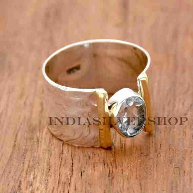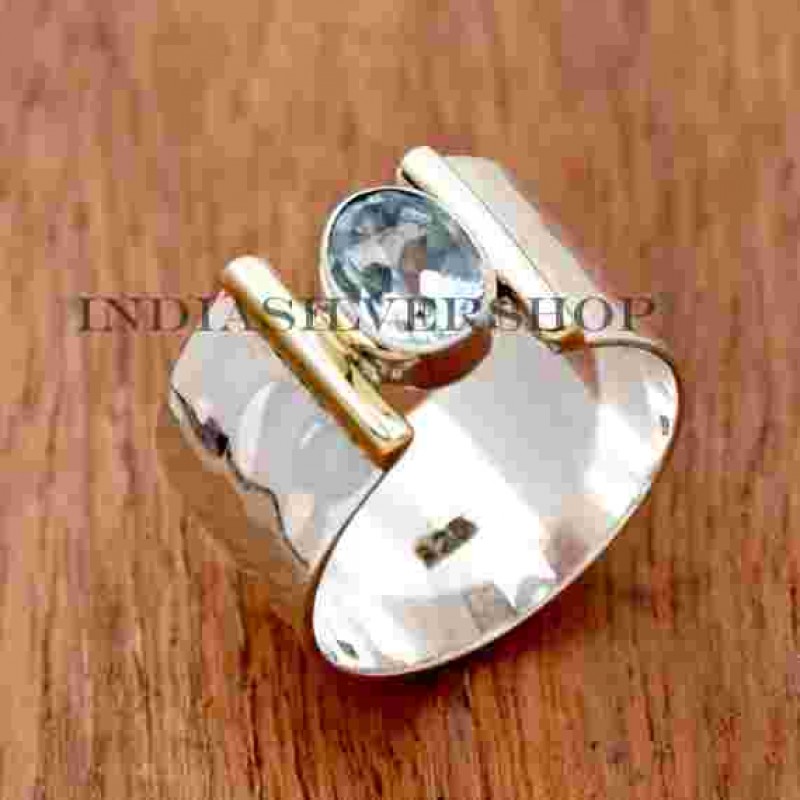 Doğal Mavi Topaz Taşlı Yüzük, 925 Ayar Gümüş El Yapımı Yüzük, İki Tonlu Yüzük, Dövme Yüzük, D