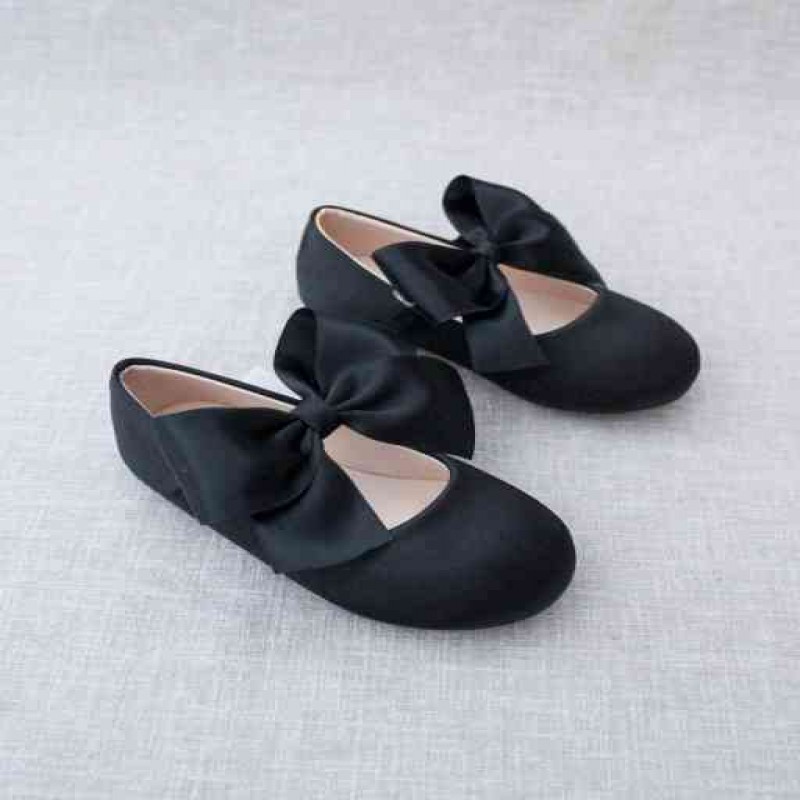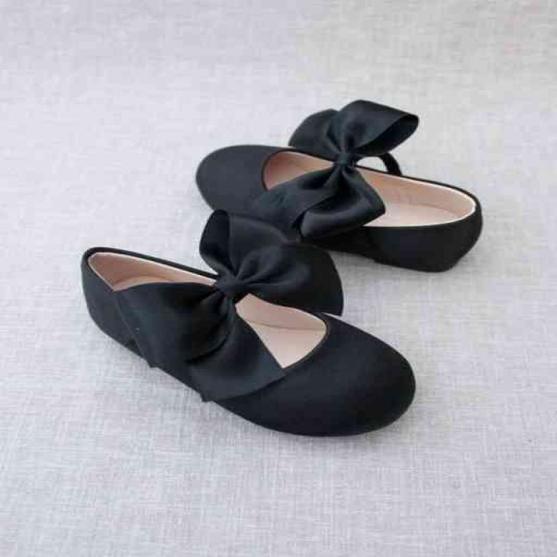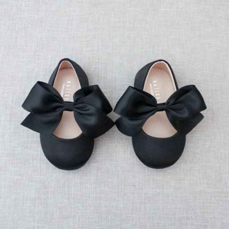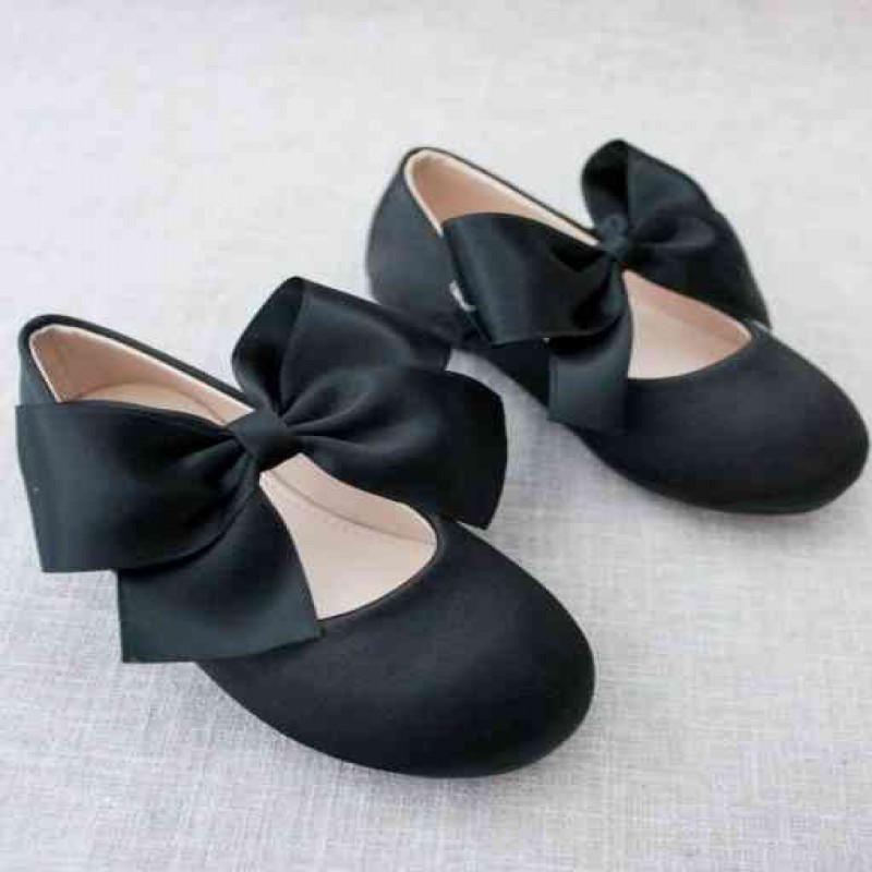 Saten Fiyonklu Siyah Saten Maryjane Ayakkabı, Sonbahar Çiçekçi Kız Ayakkabıları, Kız Çocuk Ayakkabıl