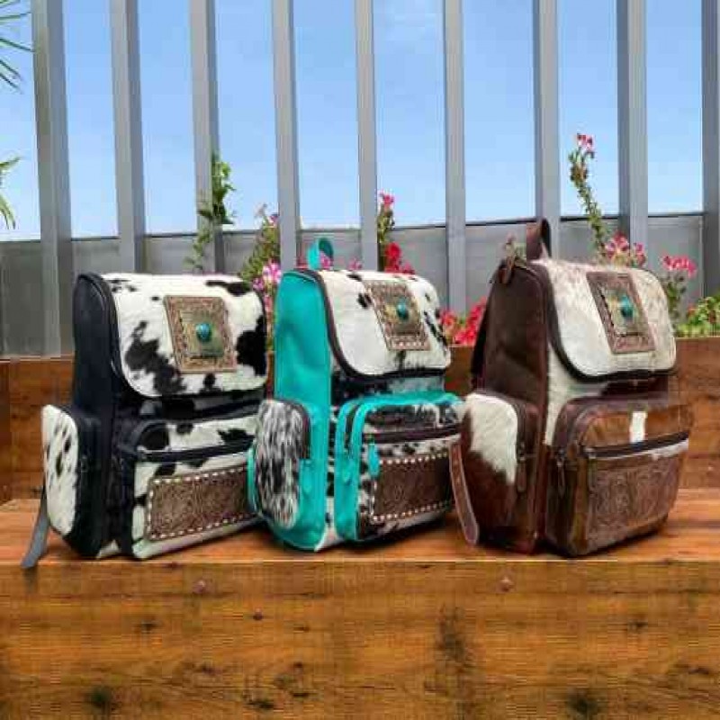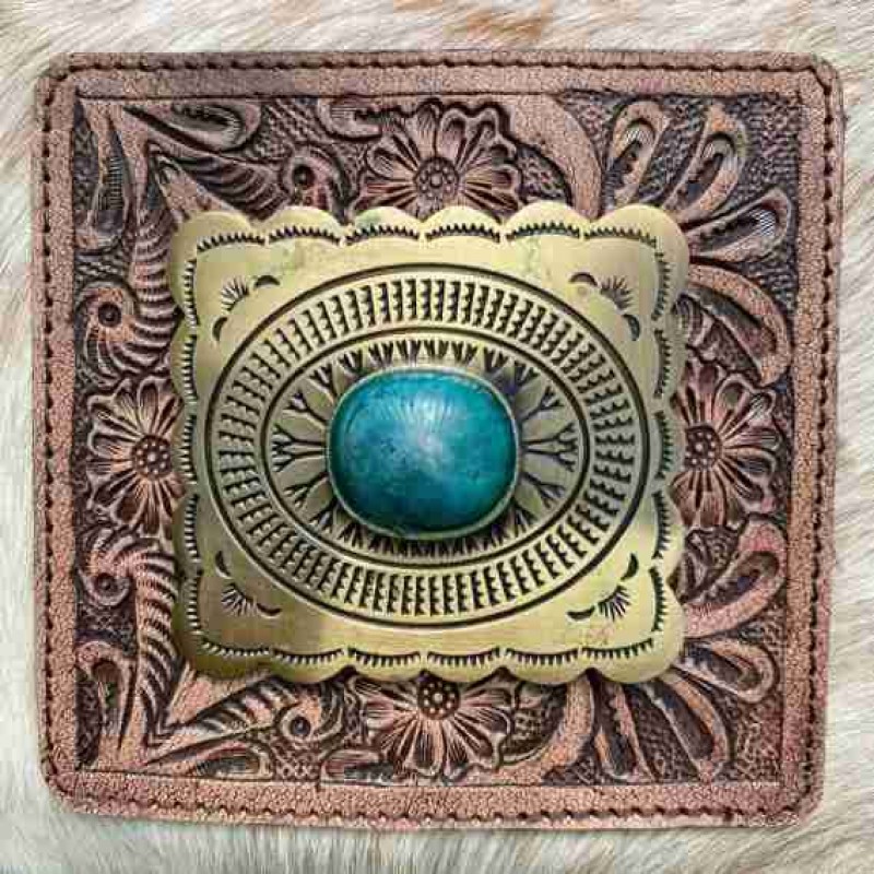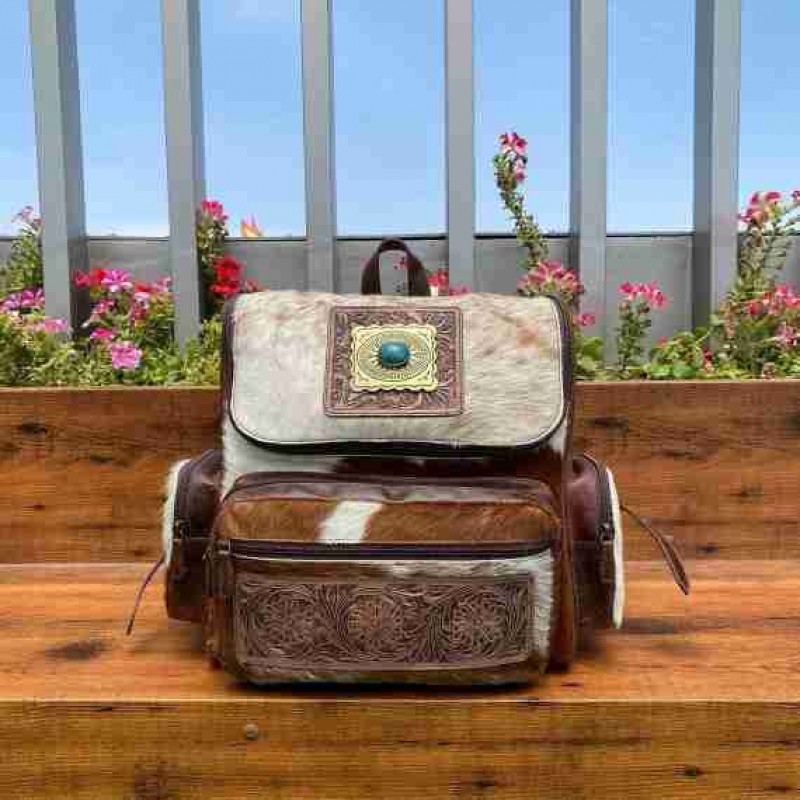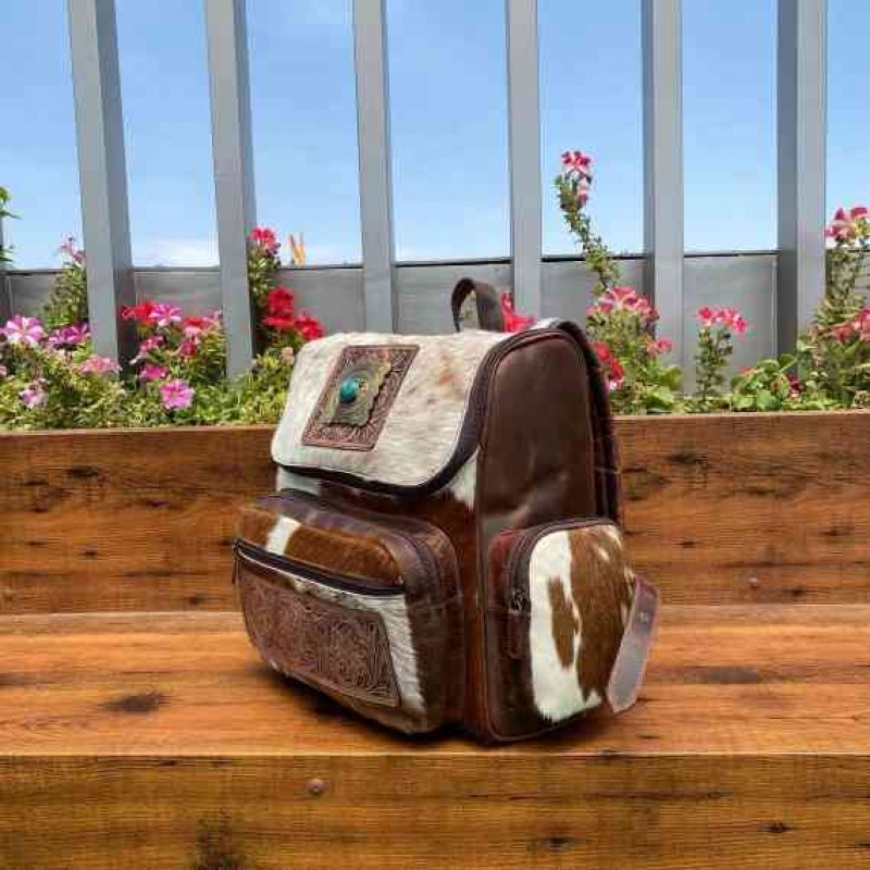 7. Ön tarafta, bu sırt çantasına şık bir görünüm kazandıran zarif işlenmiş deri kaplamalı kenar tasarımı ile deri üzerinde turkuaz taş saçlar verilmiştir.