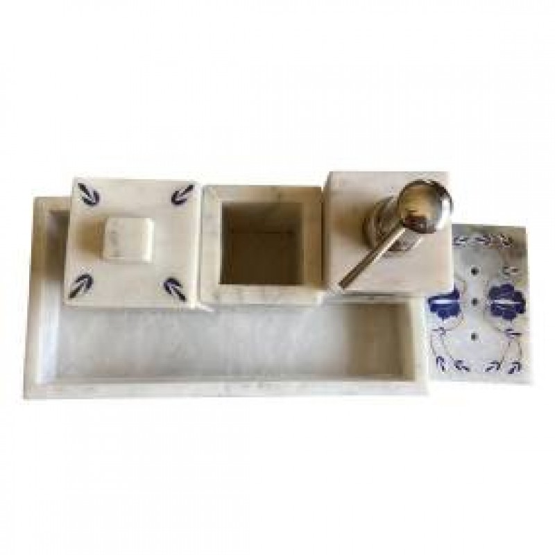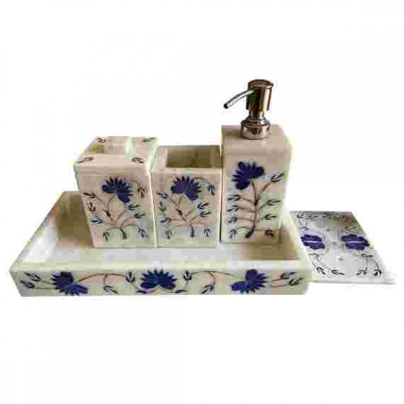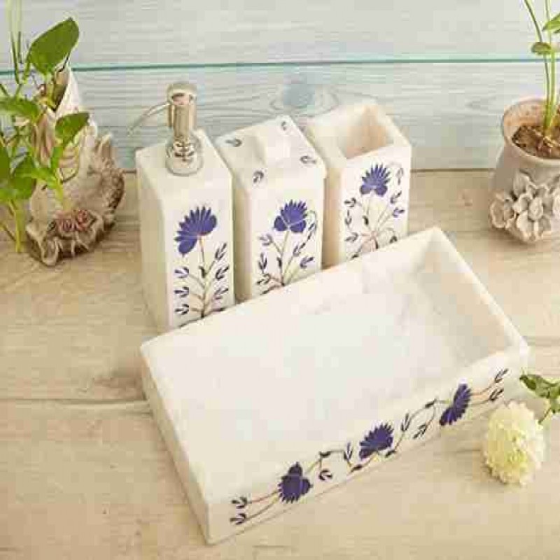 Zarif Beyaz Mermer Tasarım: Cazibe ve zarafet dokunuşu için narin mavi çiçek desenli kaplamalar içeren çarpıcı beyaz mermer banyo aksesuarları setimizle banyonuzu bir incelik cennetine dönüştürün.