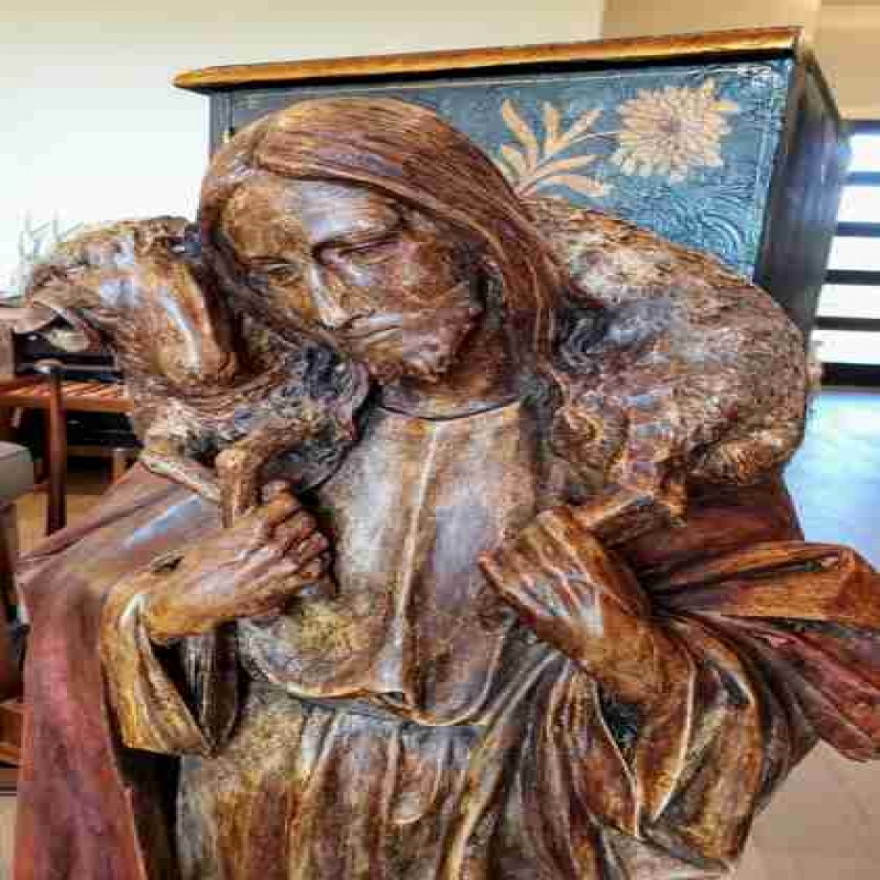 1700'lü yıllardan kalma, büyük, tek bir masif ahşap kütükten oyulmuş ve yontulmuş, olağanüstü derecede ince ayrıntılara sahip, alçı kaplı, çok renkli süslenmiş ve zengin yaldızlı, yontulmuş bol dökümlü giysilerle ayakta duran İsa figürünü içeren nadir, türünün tek örneği dini eser, Omuzlarının üzerinde muhteşem dokulu bir kuzu figürü taşıyor, ön tarafı kısmen oyuk, kaide kaidesi üzerinde yükseliyor.