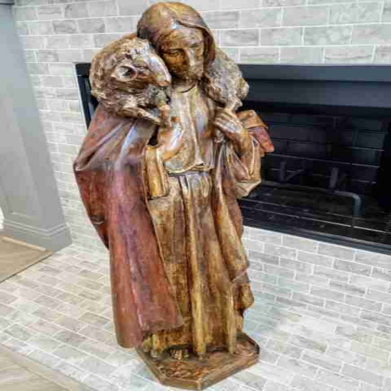 İyi Çoban İsa'yı tasvir eden muhteşem ve anıtsal antika el oyması ve çok renkli boyalı yaldızlı ahşap sunak figürü heykeli.