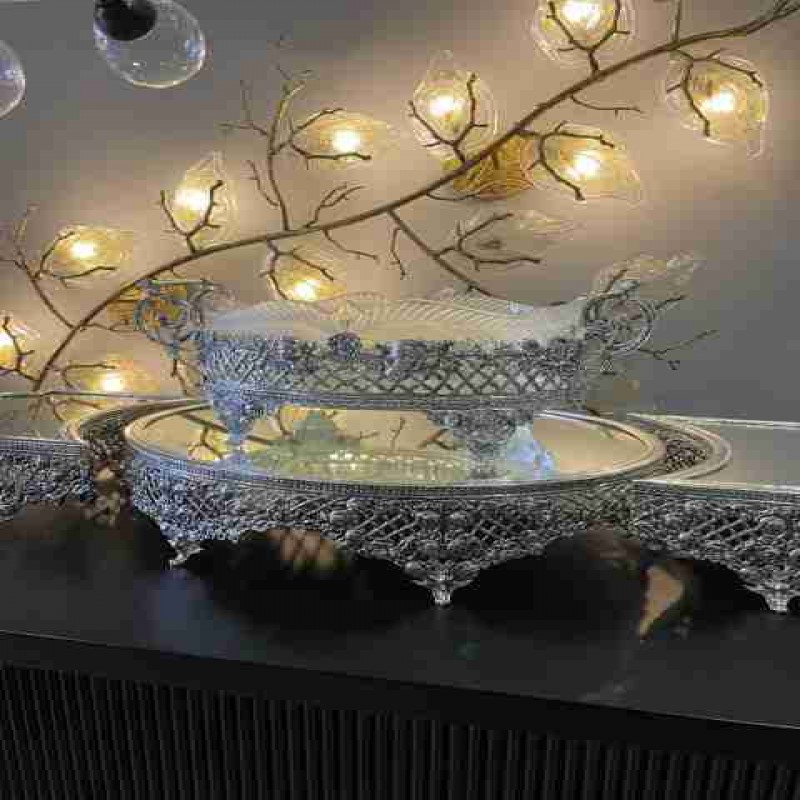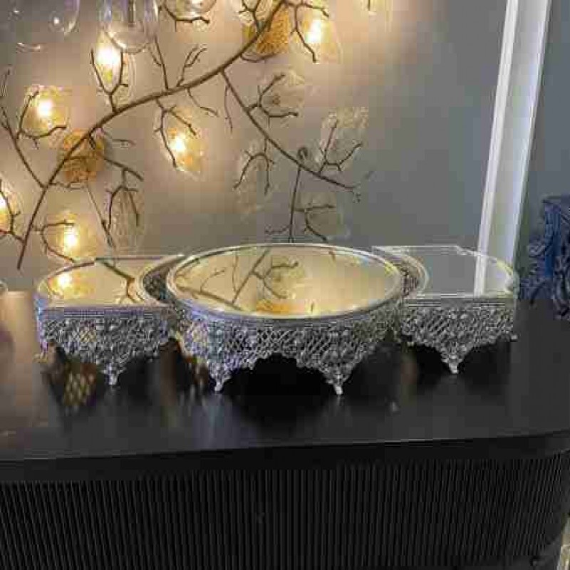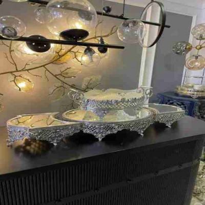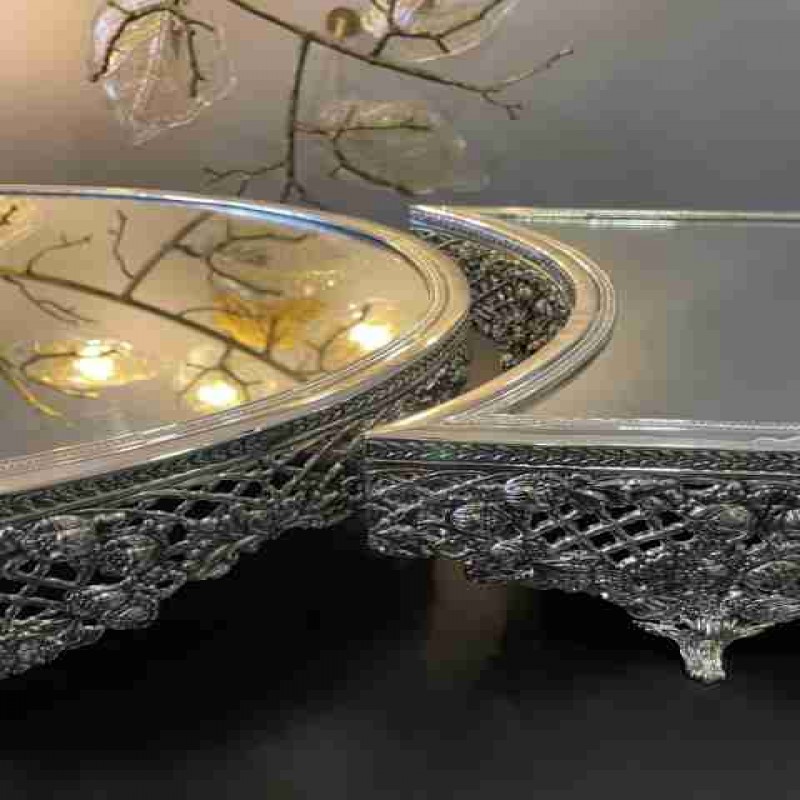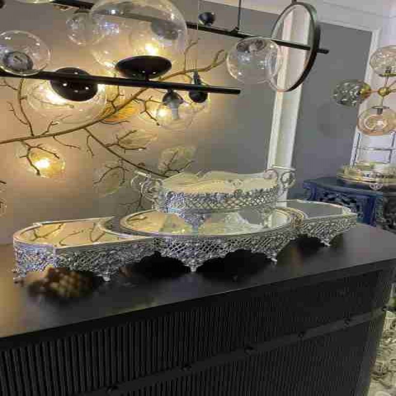 Merhaba. Bu güzel 3+1 parçalı stand, yüksek kaliteli pirinç malzeme kullanılarak üretilmiştir. Kaplama olarak gümüş kaplama kullanılmaktadır.