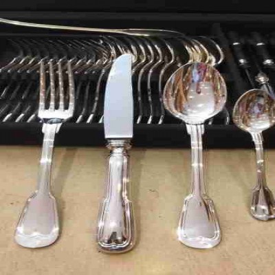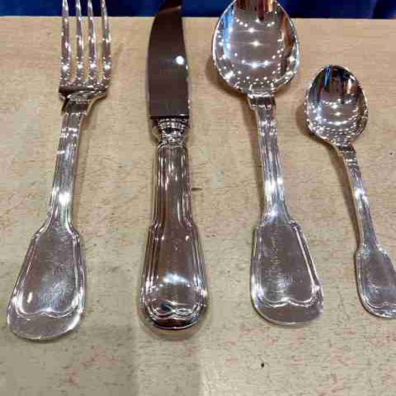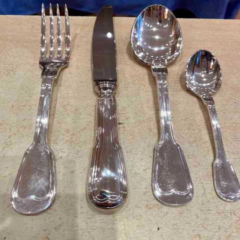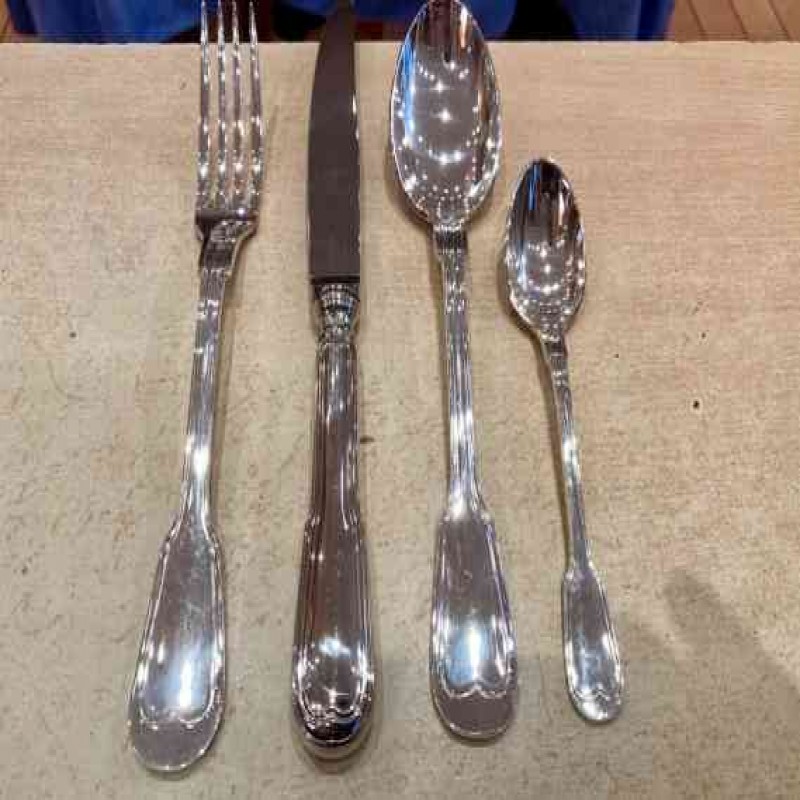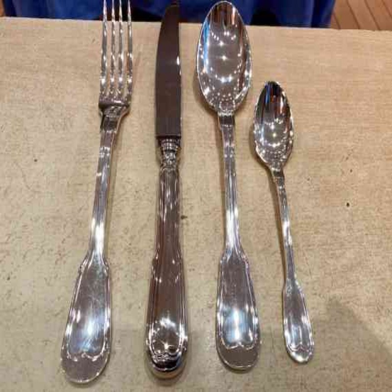 Gümüş kaplama çatal bıçak takımı şunları içerir: 12 adet yemek çatalı, 12 adet yemek kaşığı, 12 adet yemek bıçağı, 12 adet küçük kaşık, 1 adet çorba kepçesi.