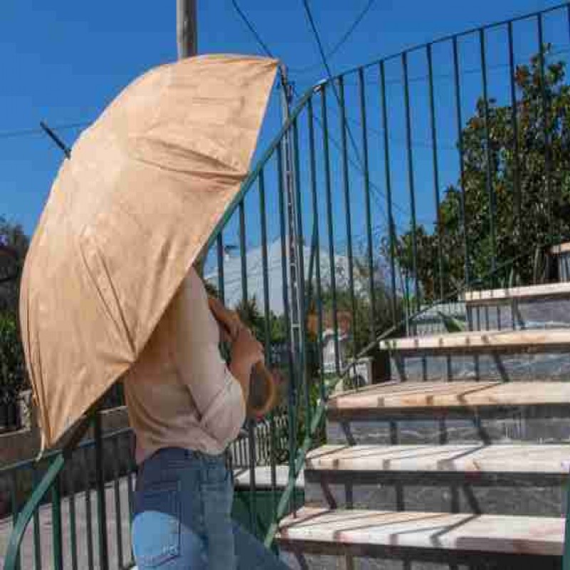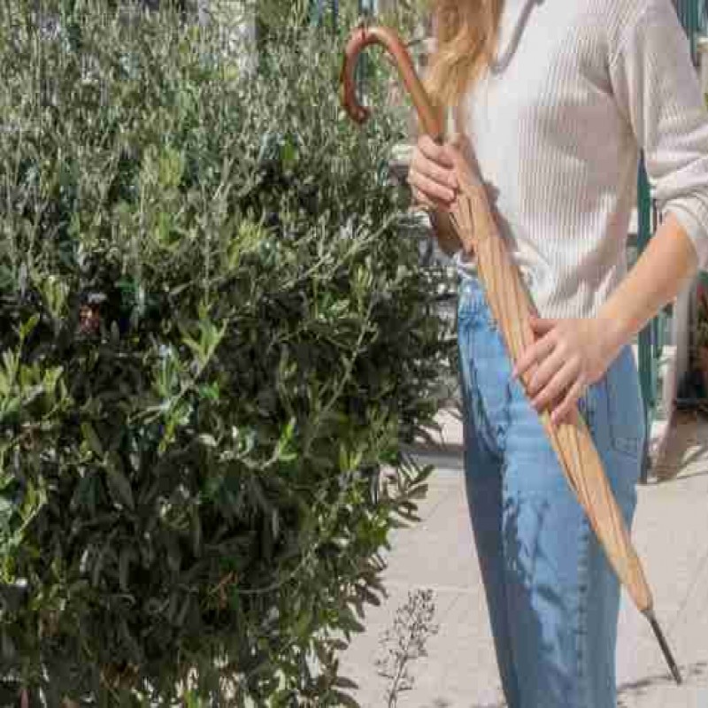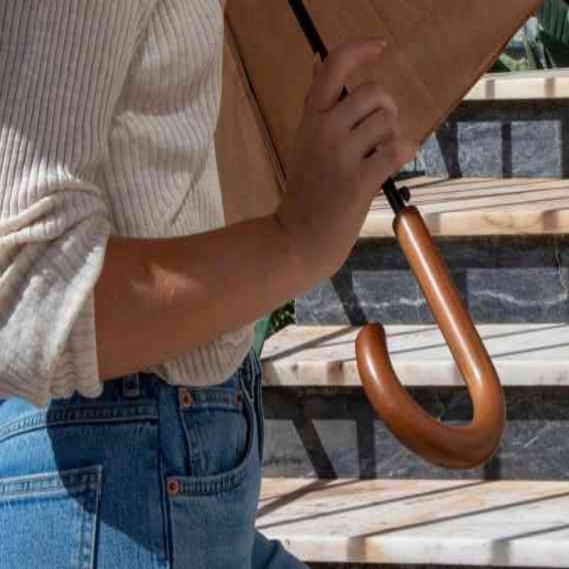 Doğal olmasının yanı sıra, kahverengi mantar rengi ve bir ahşap sapla tamamlanan toprak tonlarında bir his verir ve şemsiyenizin güvenli bir şekilde kapalı ve düzenli bir şekilde saklanması için bir düğme özellikli basmalı kapanma sistemine sahiptir.