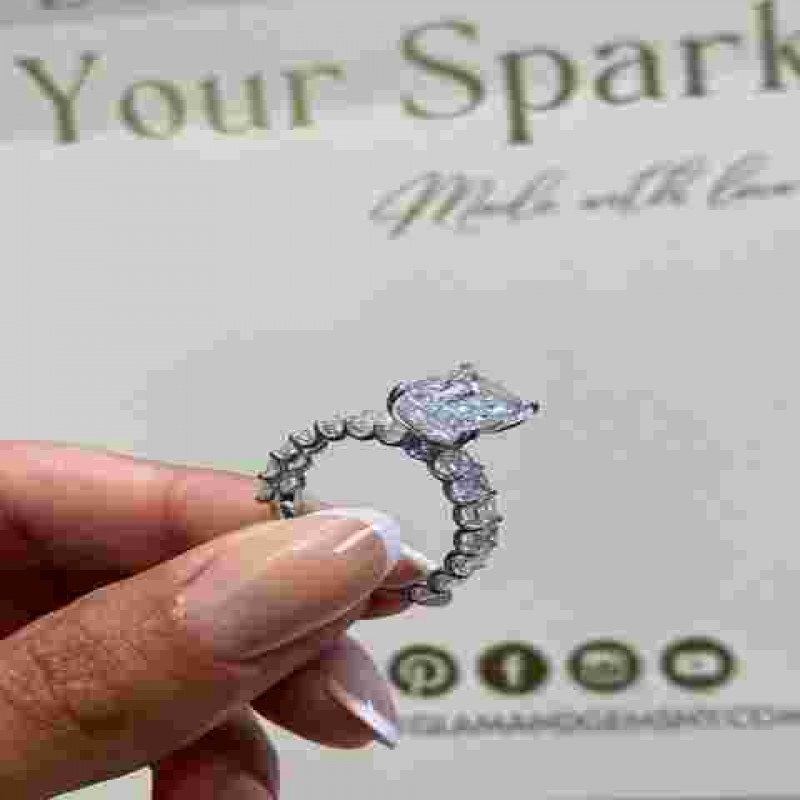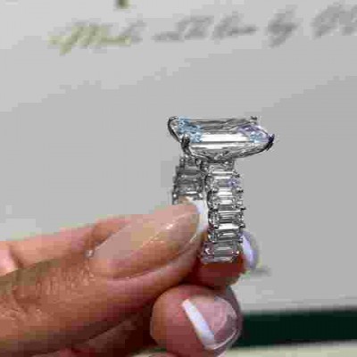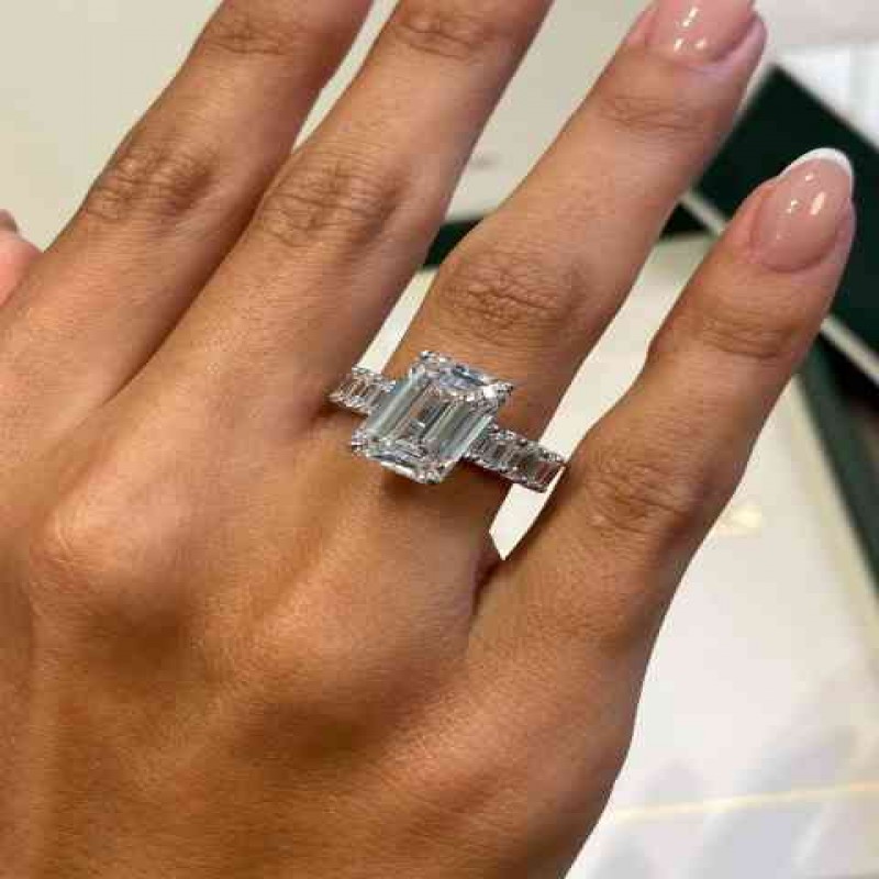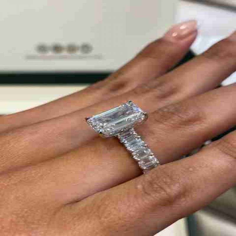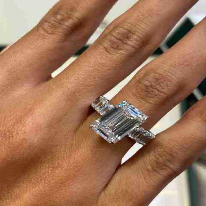 Bu büyüleyici yüzüğün kalbinde Pave'de özenle seçilmiş 5 karatlık Zümrüt kesim pırlanta yer alıyor. Zamana meydan okuyan cazibesi ve büyüleyici berraklığıyla bilinen zümrüt kesim, inceliği ve sarsılmaz sevgiyi simgeliyor. Parıldayan 3 karatlık Zümrüt kesim pırlanta yan taşlardan oluşan zarif bir sıra, zümrüt kesim pırlantanın yanında lüks bir dokunuş katıyor ve genel ihtişamını artırıyor.