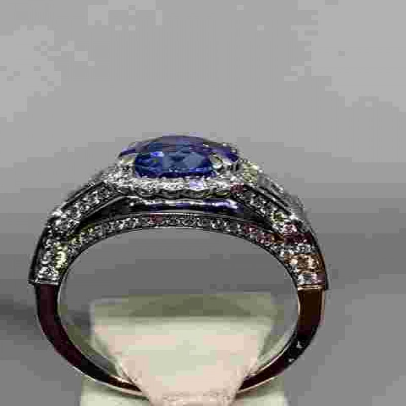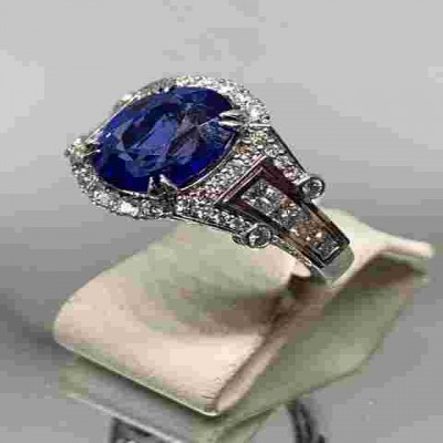 Sertifikalı 4,85 karat oval kesim ince Seylan safir merkezi ve 1,26 karat beyaz pırlantalardan oluşan bu yüzük her açıdan parlıyor.