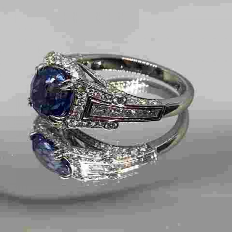 4,85 karat oval kesimli ince Seylan safir merkezi ve 1,26 karat beyaz pırlantalarla bu yüzük her açıdan parlıyor.