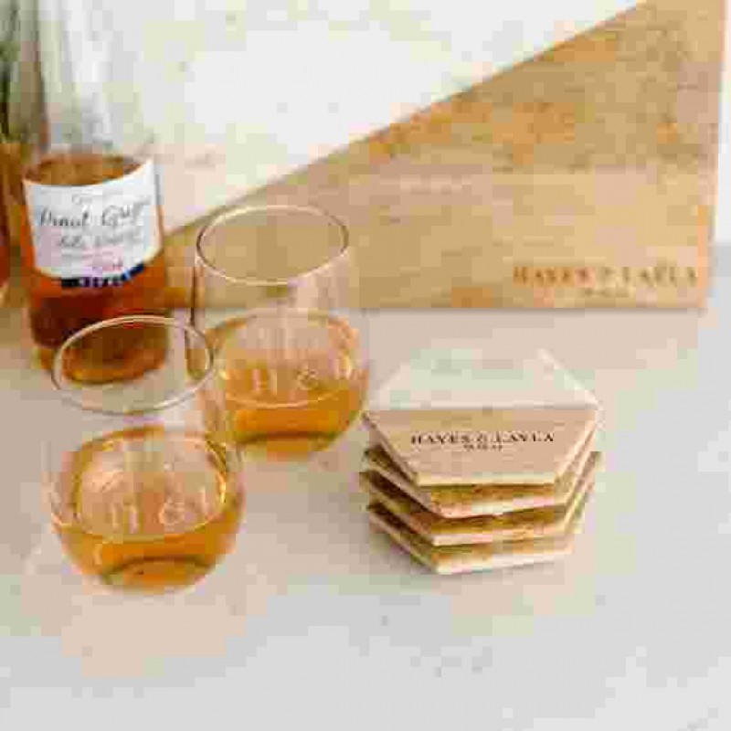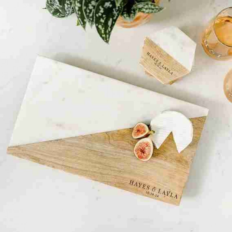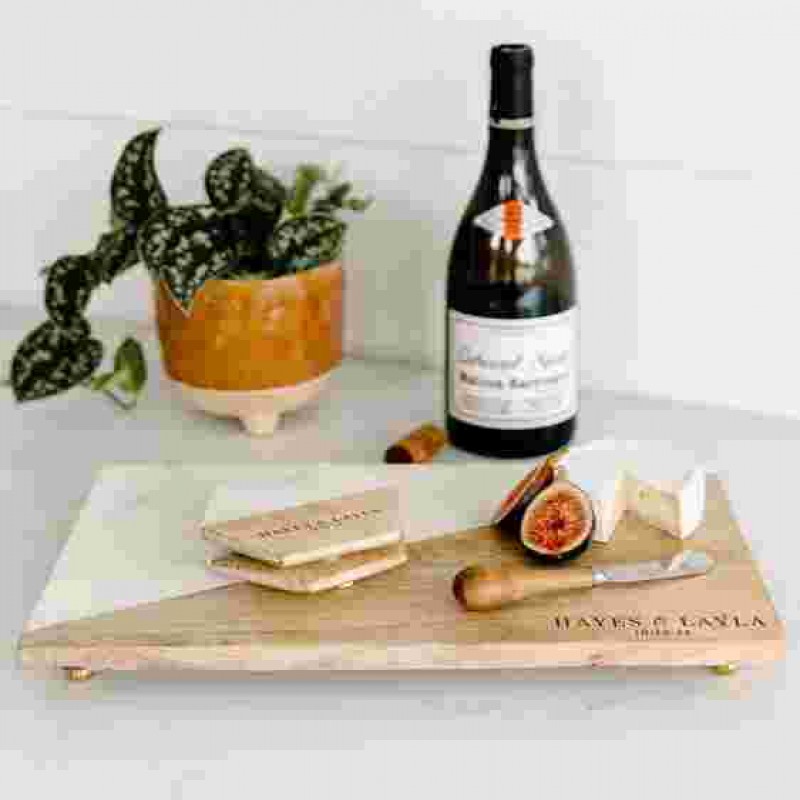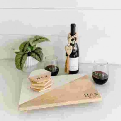 Şarküteri peynir tabağı seti, tamamı kişiselleştirilebilen servis tepsisi, 2'li şarap kadehi seti, 4'lü bardak altlığı ve bir şarap şişesi askısı içerir.
