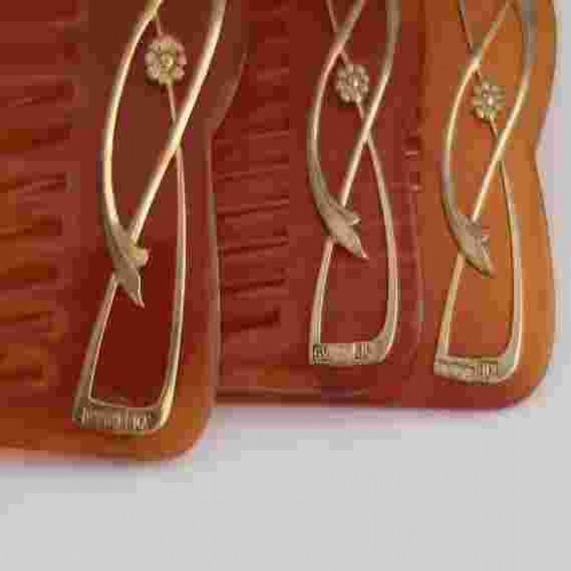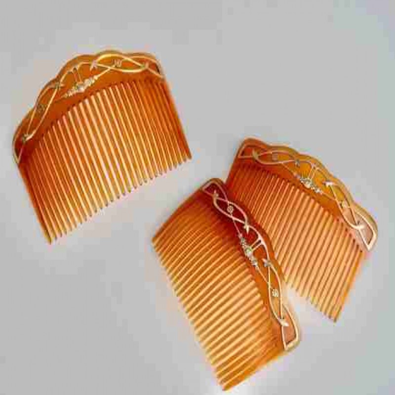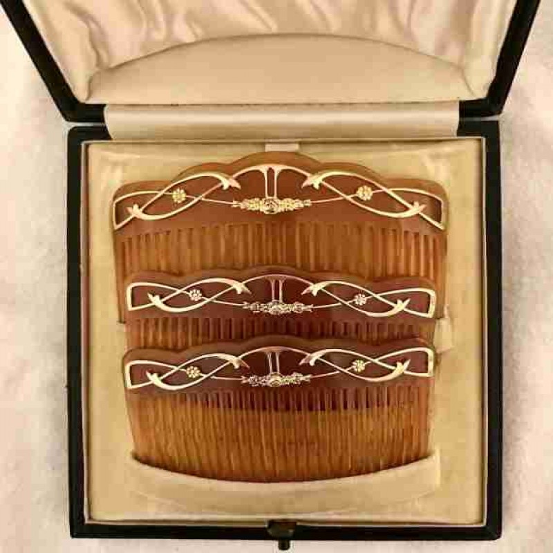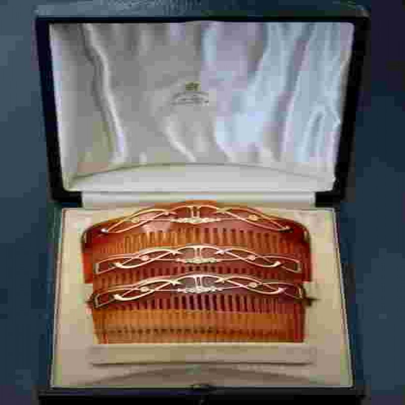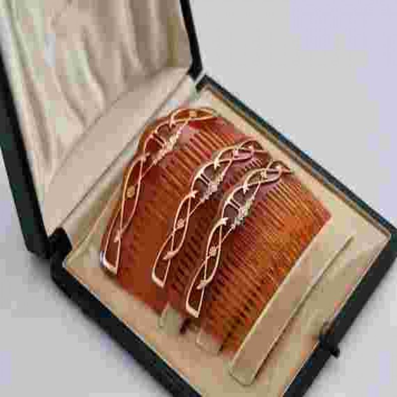9 ayar altın çiçek çelengi ve kavisli dekorasyonla süslenmiş zarif Art Nouveau/Edward tarzı saç taraklarından oluşan üç parçalı uyumlu set. Taraklar, Fransa'daki kaliteli mücevher üreticisi Gourdel Vales & Co. için 9 ayar ve G. V & Co. olarak işaretlenmiştir. Krem rengi ipek ve kadife astarlı, altın rengi perakendecinin adı ~J C Vickery, 179, 181 & 183 Regent St. W ile damgalanmış orijinal işlenmiş yeşil deri çantada sunulmaktadır.