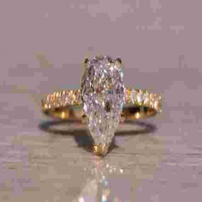 The West River: 2,12 Karat Armut Şekilli Pırlanta Nişan Yüzüğü. Yüzüğün merkezinde 2,12 karatlık armut parlak kesim doğal pırlanta bulunuyor. Elmas, Amerika Gemoloji Enstitüsü'nün berraklık derecesi Vvs1'e ve gelişmiş renk derecesi F'ye sahiptir. Elmas çok iyi cila simetrisine sahiptir ve floresans göstermez ve orijinal GIA Raporu: GIA Raporu #2221713091 ile birlikte gelir. Merkezin her iki yanında bir dizi Fransız set yuvarlak parlak kesim doğal elmas var. 0,33 karat montajdaki toplam elmas ağırlığıyla görünümü tamamlamak için hem taşın altında hem de tabanda parmakla bakıldığında gizli bir elmas halesi bulunmaktadır. Yüzük 18 ayar sarı altından yapılmıştır ve şu anda 5 3/4 parmak boyutundadır ancak talep üzerine ek ücret karşılığında herhangi bir parmak boyutuna da ayarlanabilmektedir. Harika bir keşif ve yüzük için olağanüstü bir değer!