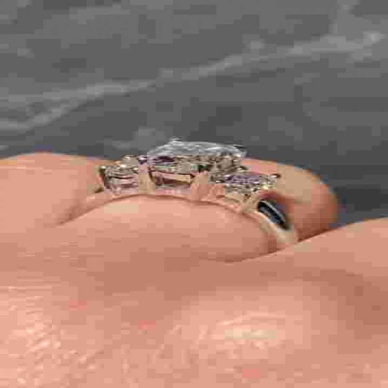 Bu üç taşlı pırlanta nişan yüzüğü, oval kesimli bir orta taş ve oval kesimli yan taşlardan oluşuyor.