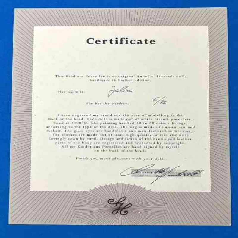 Annette Himstedt Alman porselen bebeği 'Jalisa". Orijinal 'Macaristanlı Kız', 1996 yılında sadece 76 el yapımı oyuncak bebek arasında 6. sırada yer aldı. Jalisa, 21 inç boyundadır ve zengin, kumral insan saçına sahiptir. Minik örgüleri, daha büyük örgülerin etrafına sarılmıştır. Saç modeli bir sanat eseri gibi. Giysileri kaliteli kumaşlardan yapılmış ve elle dikilmiş. Bu güzel bebek, ilk satın alındığından beri sergilenmemiş veya oynanmamıştır. Bu fotoğraflar çekilene kadar davanın dışındaydı ve çok iyi durumda ve tüm evraklarıyla birlikte dumansız ve evcil hayvan bulunmayan bir evden geliyor.
