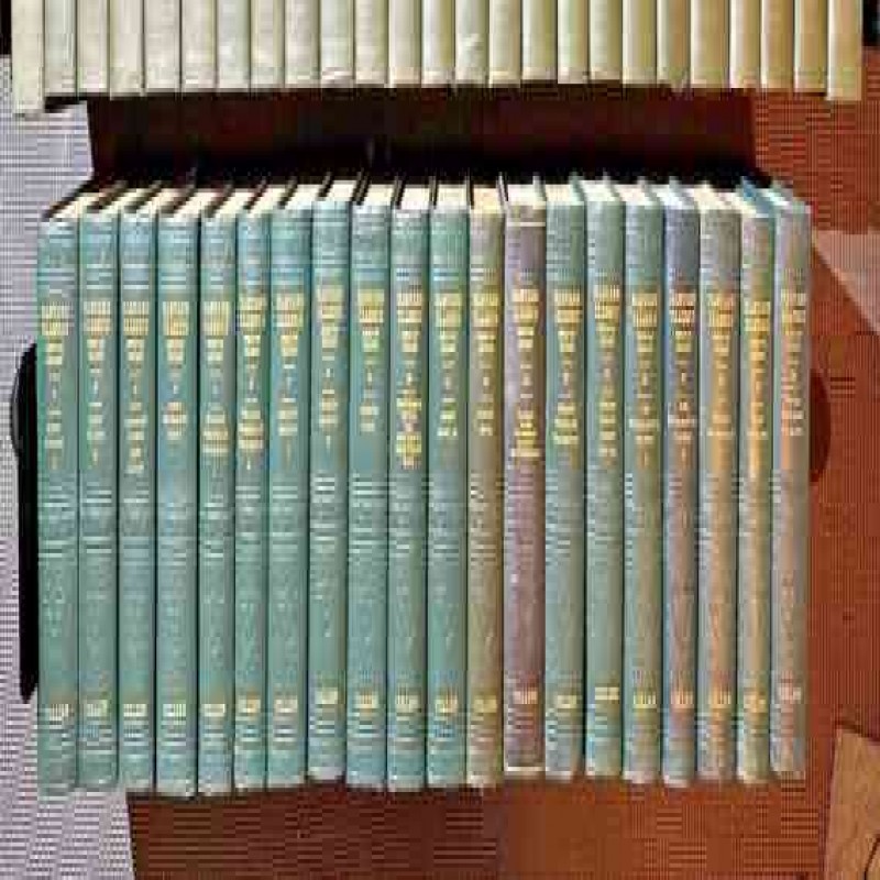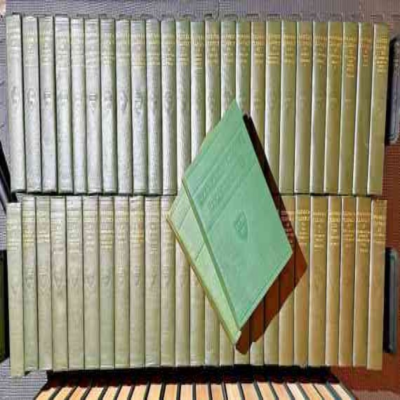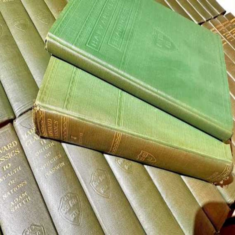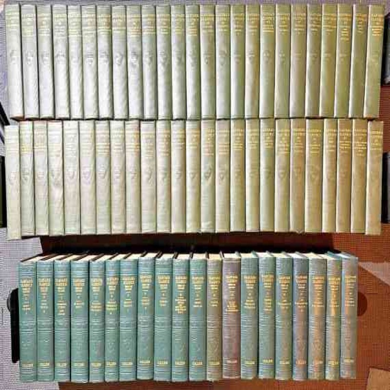 Bu, 1911'de basılan ve koyu yeşil kumaşla ciltlenmiş 52 ciltlik The Harvard Classics'in yanı sıra 20 ciltlik The Shelf of Fiction'dan oluşan toplam 72 kitaptan oluşan tam settir!