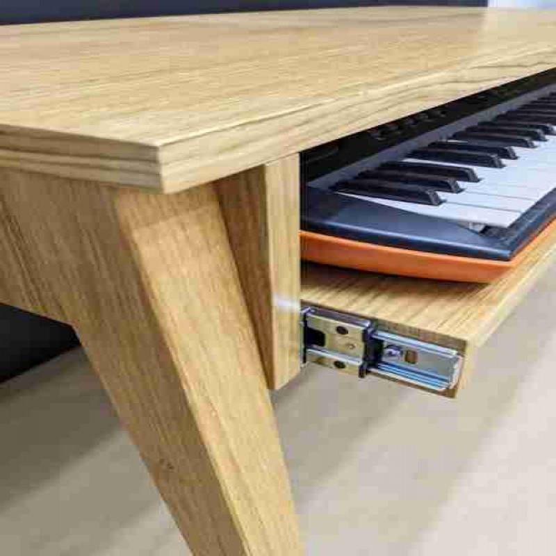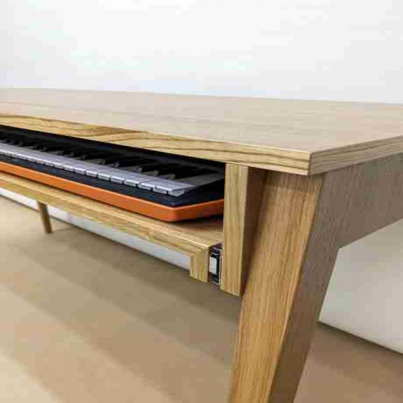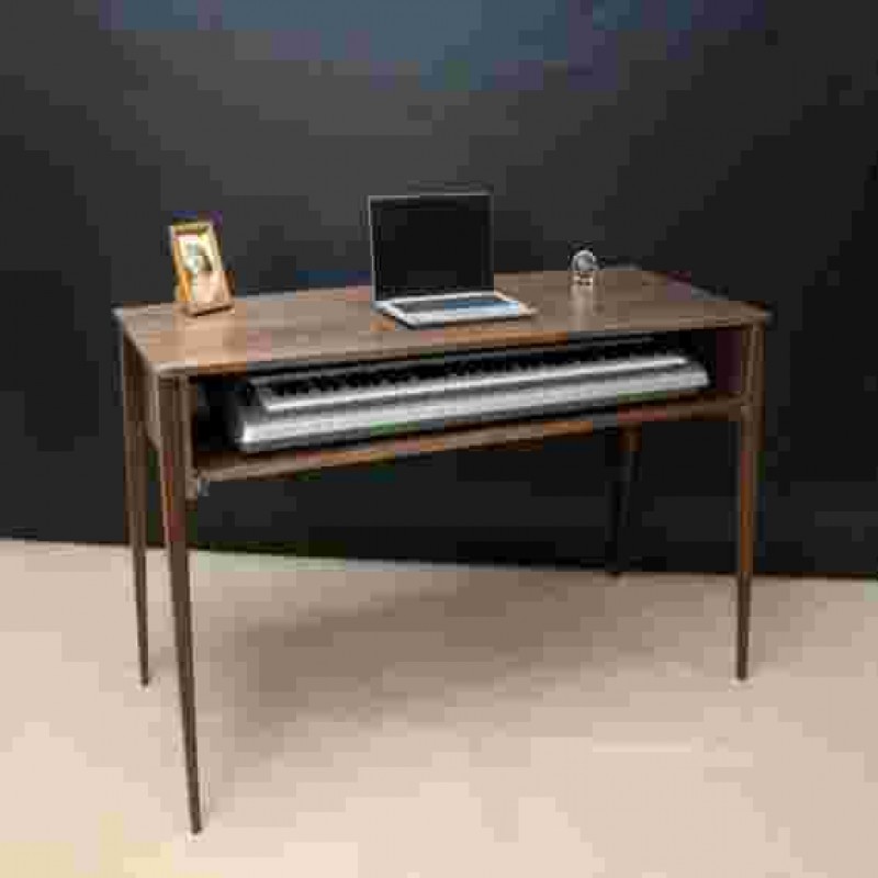 Ahşap ayaklı bu piyano çekmeceli masa evde, stüdyoda, hatta üniversitede bile rahatlıkla kullanılabiliyor. Bu tür mobilyalar müzisyenler ve DJ'ler için faydalı olabilir.